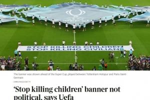 欧足联内部人士表示,该信息无关政治而是关乎人性,事实上可以说这只是常识,并强调该活动早在利物浦前锋萨拉赫上周质疑欧足联对遇难巴勒斯坦球员的悼念之前就已策划。根据欧足联规定,赛前、赛中及赛后不允许在体育场及周边区域出现政治性信息或行为,而该横幅未提及任何具体冲突。
